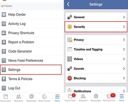 أولاً : قم بالدخول إلى برنامج فيس بوك الموجود بهاتفك بعد ذلك قم بالدخول إلي الإعدادات Settings بعد ذلك قم بالدخول إلي الأمان “Security” كما تري بالصورة التالية :