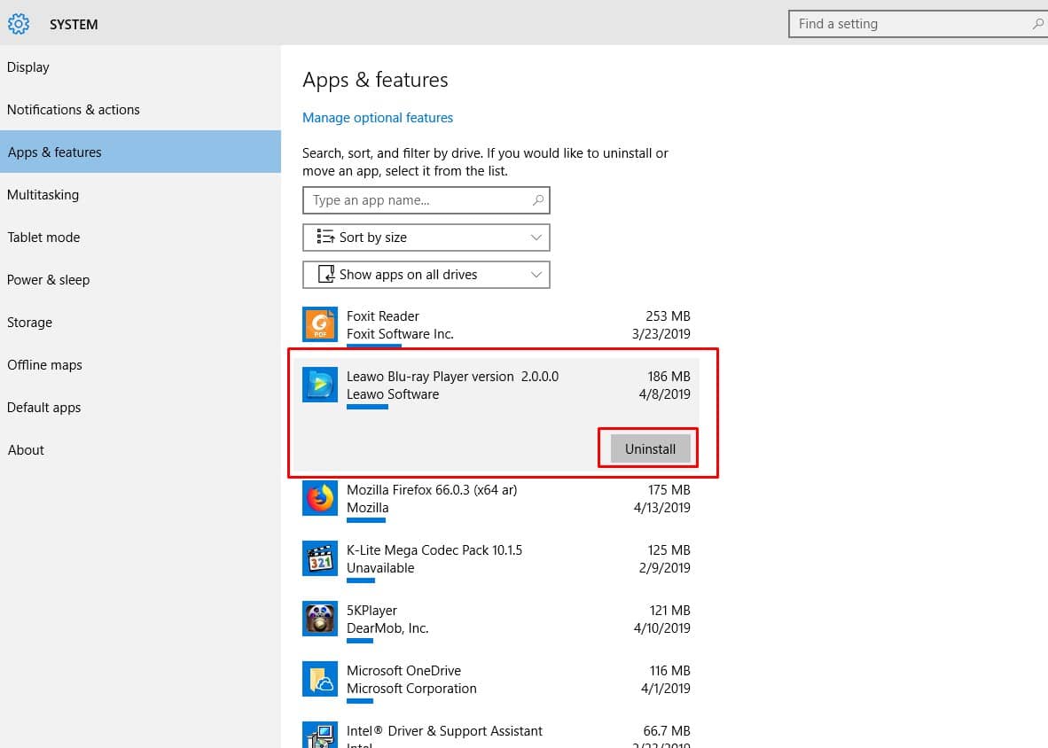 - وهذه الطريقة تمكنك من الوصول الي قائمة جميع البرامج بسرعة كبيرة وذلك من خلال الضغط علي قائمة Start ثم اختيار الإعدادات Settings واختيار قائمة النظام System ثم الضغط علي التطبيقات Apps and features .