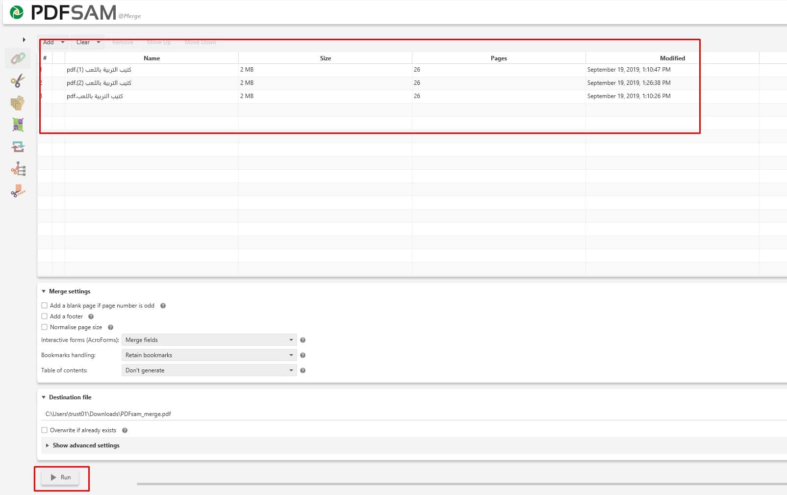 - بعد وضع الملفات المراد دمجها في ملف واحد قم بالضغط على Run .