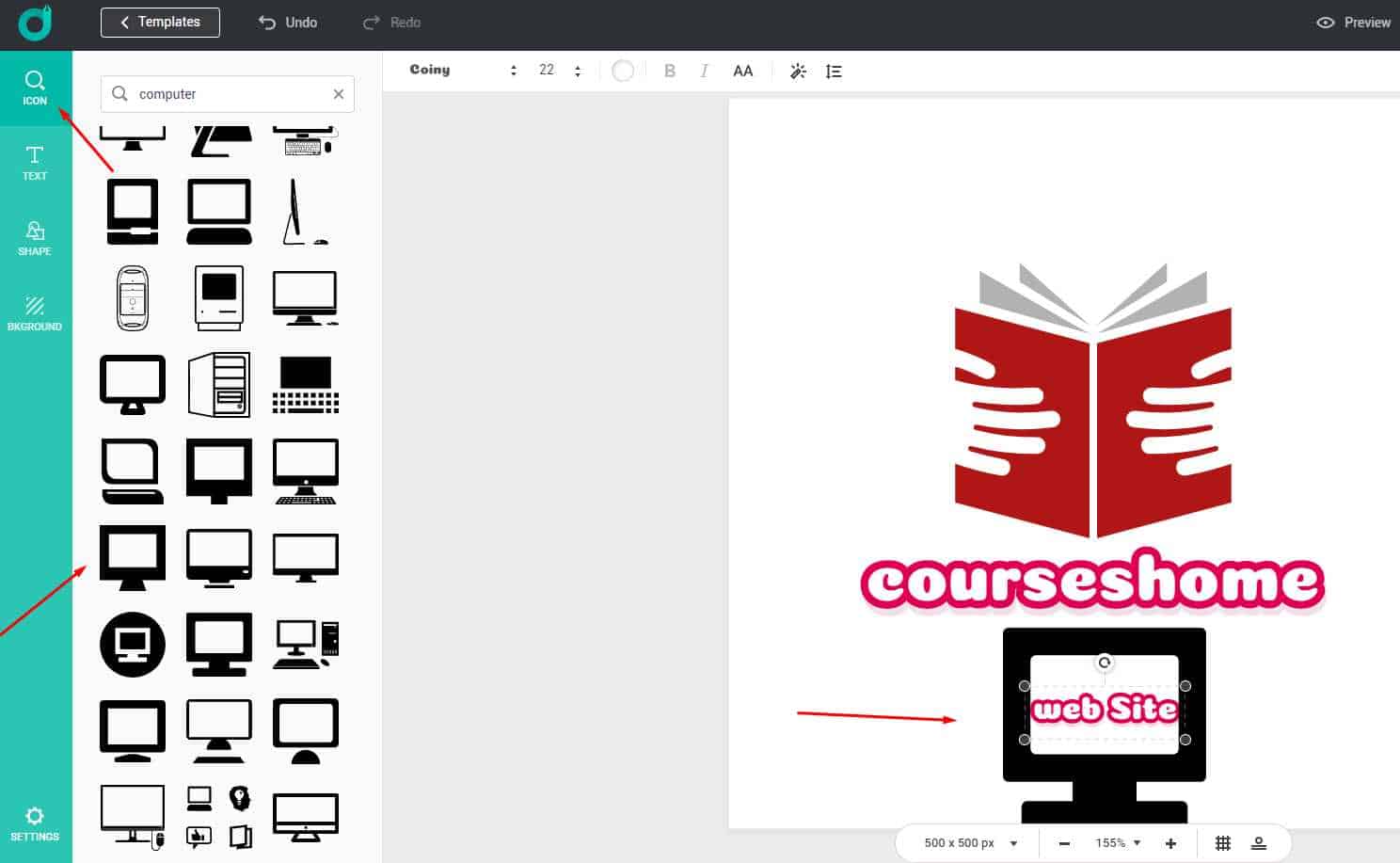 - يمكنك إضافة أيقونة للوجو تناسب نشاطك وذلك لجعله لوجو جذاب ومعبر عن الهدف ،وللقيام بذلك قم بالضغط على خيار ICON .