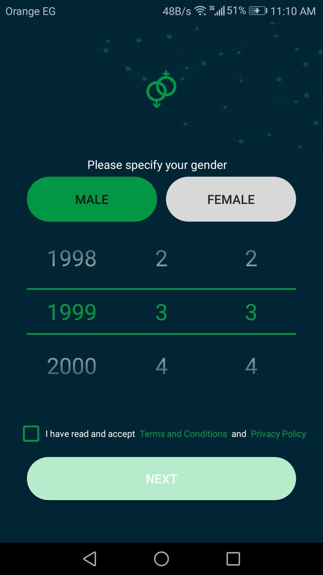 والآن ستقوم بإدخال بعض المعلومات المهمة مثل تاريخ الميلاد ثم بعد ذلك قم بالموافقة على شروط وأحكام استخدام التطبيق من خلال وضع علامه صح في المكان المحدد له ثم اضغط على Next .