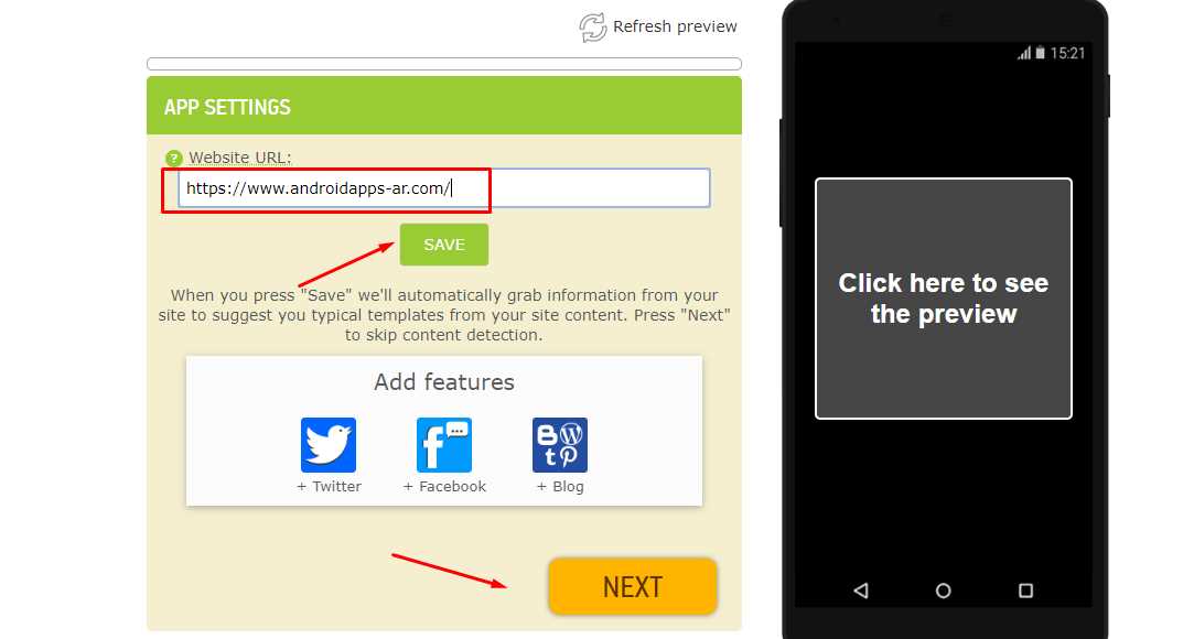 - في الصفحة التالية سوف يطلب الموقع رابط الويب للموقع الذي نرغب في عمل تطبيق اندرويد له ،لذلك يتم وضع رابط الموقع ثم نضغط على Save ثم Next .