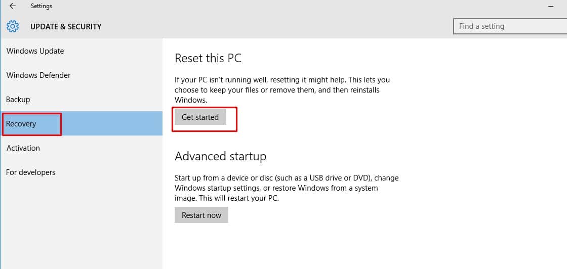 - في الصفحة التالية قم بالضغط على Recovery من القائمة ثم اضغط على Get Started .
