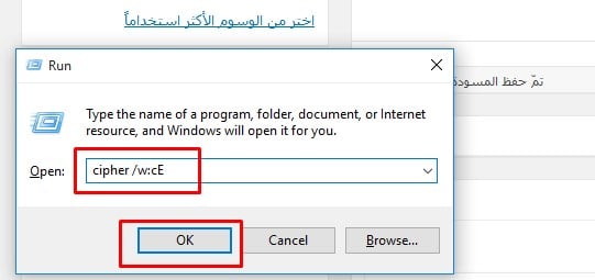 • في قائمة Run قم بكتابة cipher /w:c + حرف D وحرف الـ D هو اسم البرتيشن المراد حذف ملفاته نهائياً لذلك قم بكتابة حرف البرتيشن المطلوب بدلاً من حرف D .