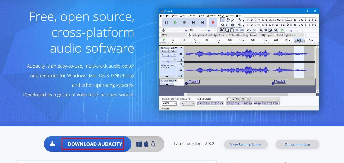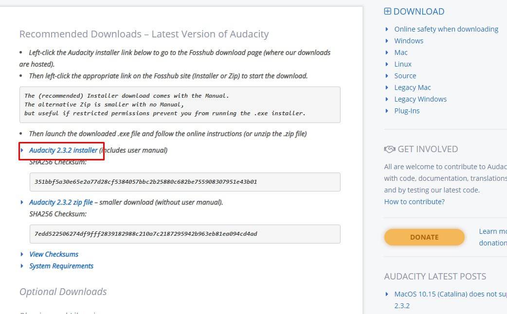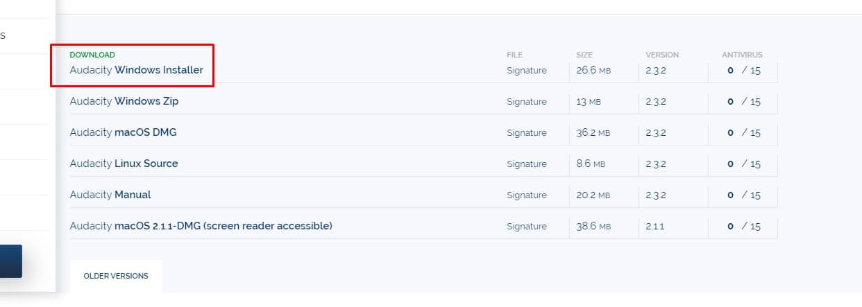- الآن قم بالضغط على خيار Audacity 2.3.2 installer للانتقال إلي صفحة التحميل .