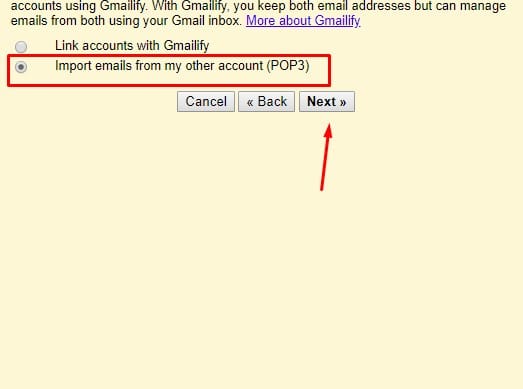 ثم قم باختيار Import emails from my other account (POP3) كما هو موضح في تلك الصورة ثم قم بالضغط من جديد على Next .