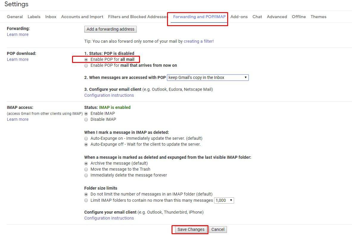 بعد ذلك قم باختيار Forwarding And POP/IMAP ومن تلك القائمة قم باختيار Enable pop For All Mail بعد ذلك توجه إلي الأسفل وقم بالضغط على Save Changes .