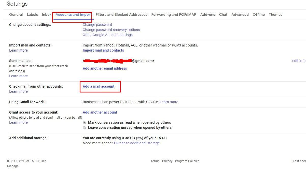 بعد تلك الخطوة قم بتسجيل الخروج من البريد القديم ثم قم بتسجيل الدخول إلي بريد جيميل الجديد ثم قم بالضغط على علامة الترس ثم Settings من جديد ولكن في تلك المرة قم باختيار Accounts and Import بعد ذلك قم بالنزول إلي الأسفل وقم بالضغط على Add A Mail Account .