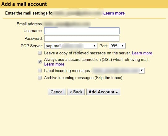 في تلك الخطوة قم بإدخال بيانات الحساب القديم كما هو موضح بتلك الصورة بالضبط وأخيراً قم بالضغط على Add Account وعلى الفور سيتم إرسال جميع رسائل البريد الإلكتروني القديم إلي حسابك الجديد دون القيام بأي خطوات إضافية .