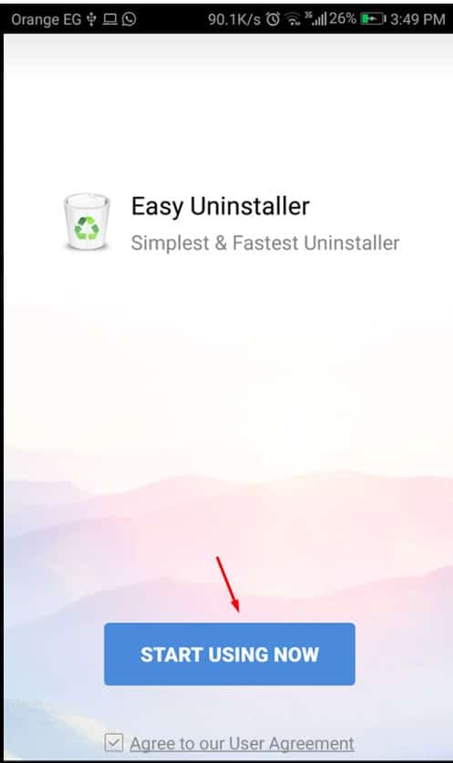 يمكنك عزيزي القارئ حل تلك المشكلة بكل سهولة من خلال خطوات بسيطة كل ما عليك القيام به هو تحميل تطبيق Easy Uninstaller والذي من خلاله ستتمكن من التخلص من أي تطبيق موجود على هاتفك وبالحديث عن كيفية تحميل هذا التطبيق الأمر في غاية السهولة كل ما عليك القيام به هو الضغط هنا وسوف يتم تحويلك إلي داخل متجر جوجل بلاي ومن هناك يمكنك البدء في عملية تحميل التطبيق على هاتفك الاندرويد دون أي مشاكل بعد ذلك ستظهر لك واجهة التطبيق كما هو بتلك الصورة بالضبط بعد ذلك قم بالضغط على Start Using Now .