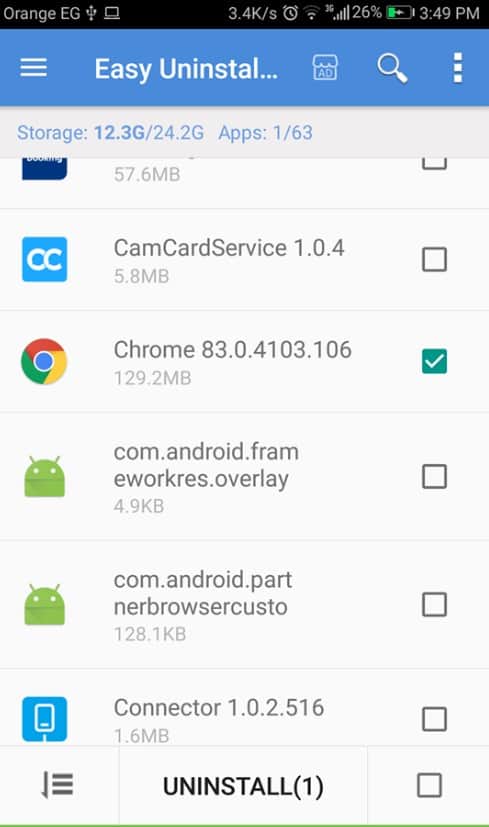 والآن كل ما عليك القيام به عزيزي القارئ هو تحديد التطبيق الذي تريد مسحة من على هاتفك بعد ذلك قم بالضغط على خيار uninstall وعلى الفور سيتم البدء في عملية المسح .