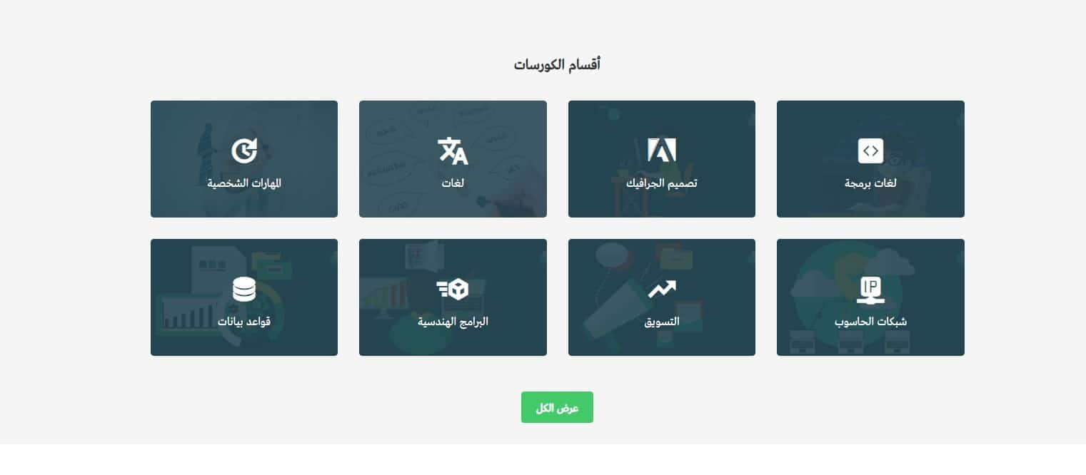 ولكن في حالة النزول إلي الأسفل قليلاً ستجد أقسام الكورسات الموجودة داخل الموقع كما هو موضح وهي تضم برمجة وتصميم الجرافيك و اللغات و التسويق الإلكتروني والذي يعد واحد من أهم المجالات في العالم .