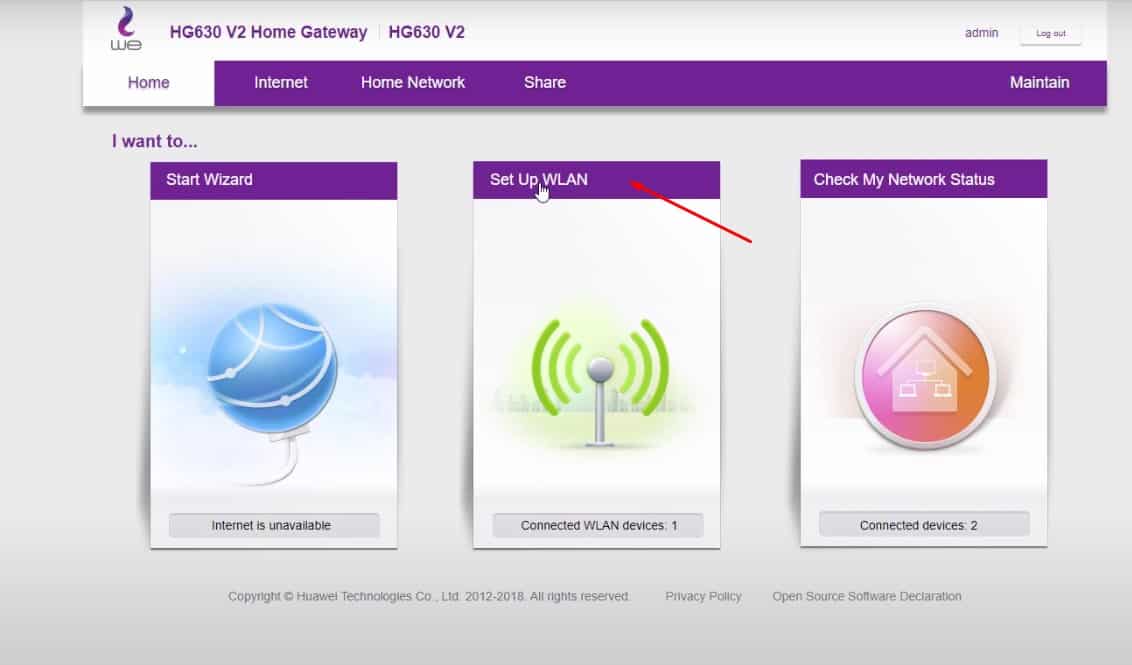 بعد ذلك قم بالضغط على خيار Set Up WLAN من أجل الدخول إلي صفحة إعدادات شبكة الواي فاي والتي من خلالها ستتمكن من البدء في عملية تغيير كلمة سر الواي فاي .