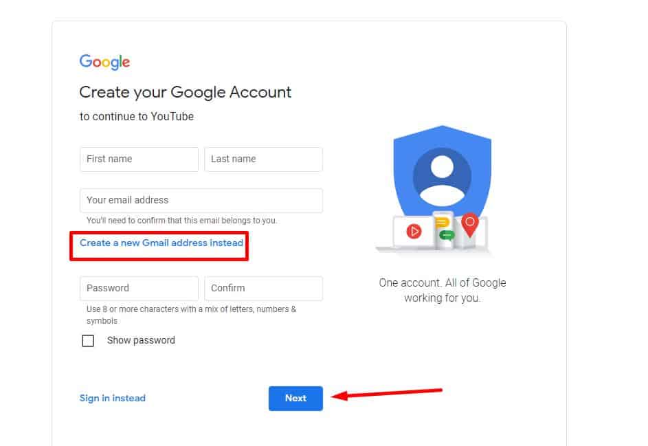 - في الخانة التالية قم بكتابة بريدك الإلكتروني، وفي حالة عدم امتلاكك لبريد إلكتروني يمكنك إنشاء بريد إلكتروني جديد عن طريق الضغط على خيار Create a new Gmail address instead لتتمكن من إنشاء بريد إلكتروني جديد لتستكمل به عملية إنشاء الحساب على اليوتيوب .