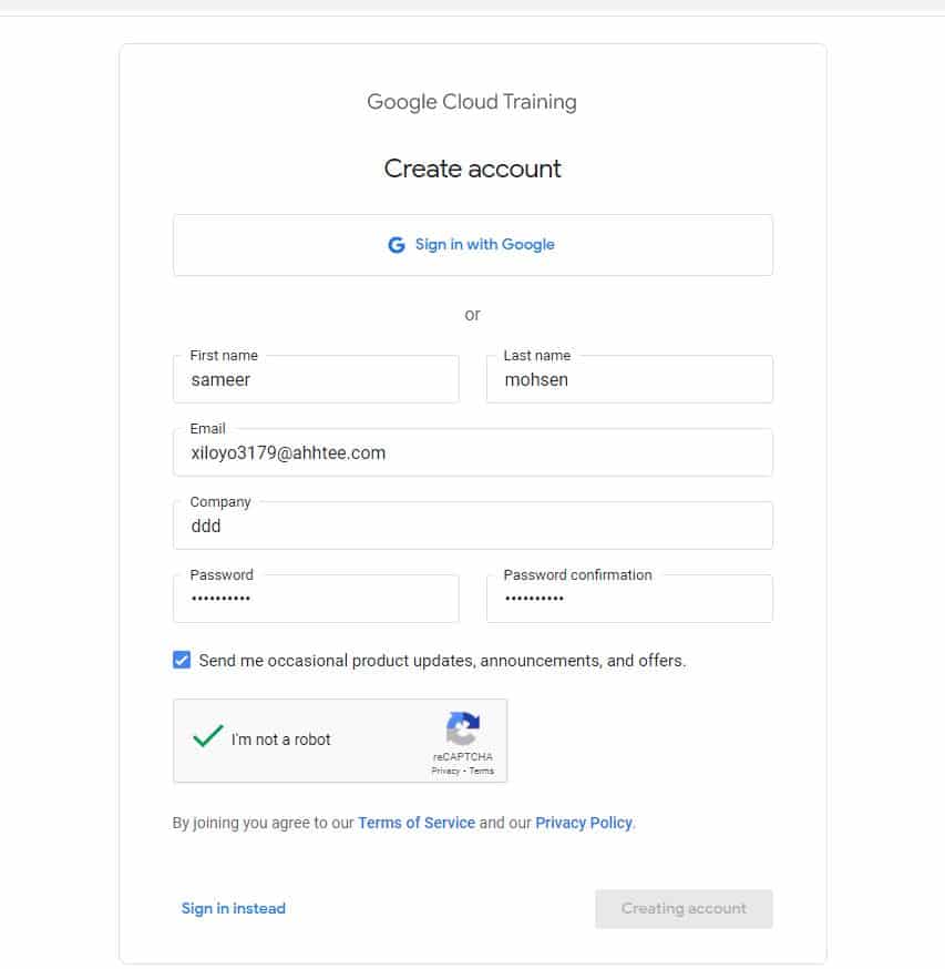 - بعد ذلك قم بالرجوع إلي موقع Google Cloud Training وقم بملأ البيانات المطلوبة مثل الاسم الأول والأخير ويمكنك استخدام أسماء مستعارة .