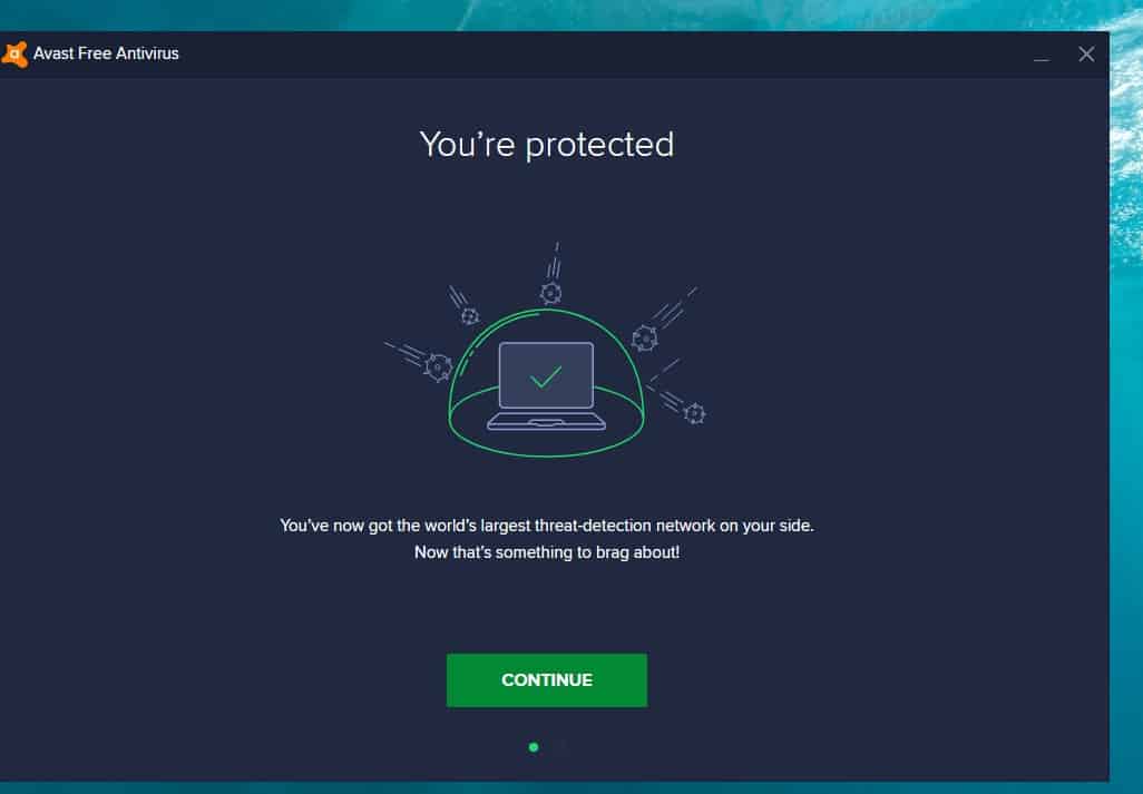 بعد أن انتهينا من عملية تحميل برنامج افاست للكمبيوتر كامل يمكنك البدء في عملية الاستخدام وهي خطوات بسيطة للغاية فقط بمجرد الانتهاء من عملية التثبيت ستظهر لك واجهة البرنامج كما هو بتلك الصورة بالضبط وهنا ستقوم بالضغط على خيار Continue من أجل الاستمرار في عملية استخدام برنامج افاست الرائع والذي يعد من أفضل برامج الحماية من الفيروسات .