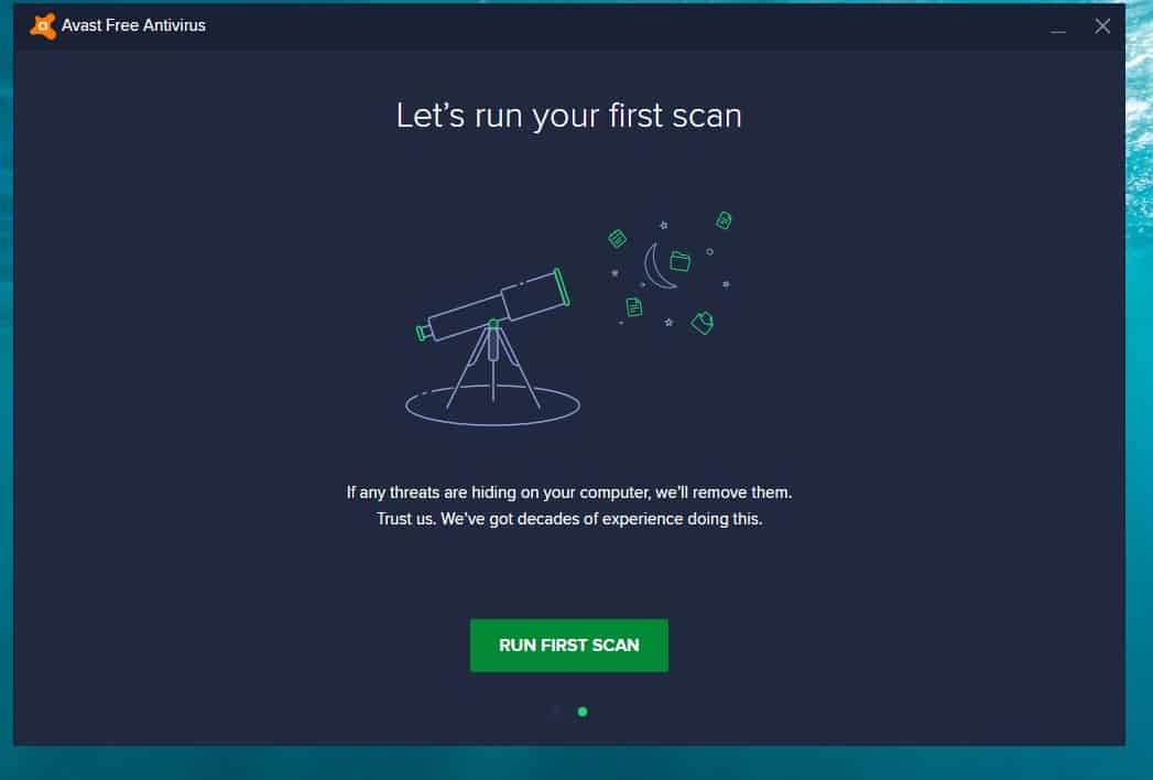 بعد ذلك سيطلب منك البرنامج أن يقوم بعملية فحص أولى لجهاز الكمبيوتر ومن الضروري القيام بهذا الأمر عند تشغيل البرنامج لأول مرة على الكمبيوتر الخاص بك وهنا ستقوم بالضغط على خيار Run First Scan من أجل تشغيل برنامج مضاد الفيروسات والبدء في عملية فحص جهاز الكمبيوتر .