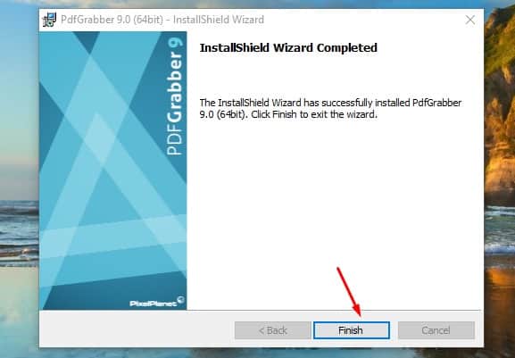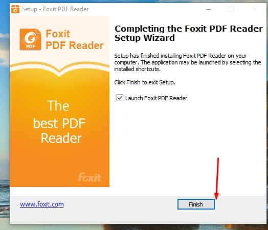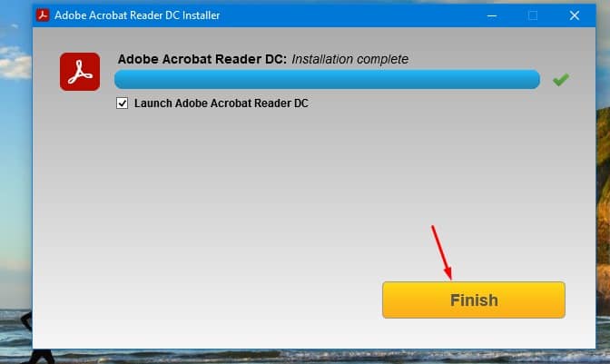 - وبعد أن تنتهي من عملية تنزيل برنامج PDF للكمبيوتر 2023 وتثبيته على الكمبيوتر الخاص بك، تستطيع أن تقوم في النهاية بالضغط على finish كما بالصورة التالية بالضبط.