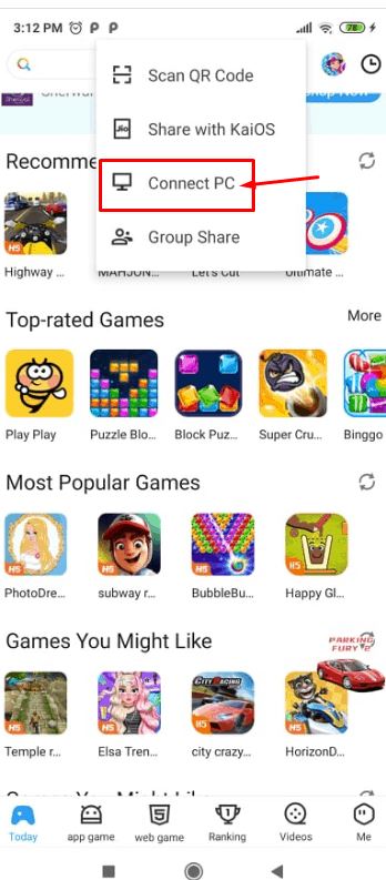 - في الجهاز الأول قم بالضغط على علامة الثلاثة نقاط داخل نافذة البرنامج ثم قم بالضغط على خيار الاتصال بالكمبيوتر الشخصي أو Connect to PC .