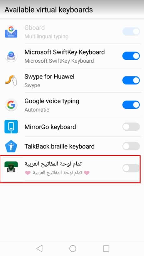بعد ذلك سيتم تحويلك إلي تلك الواجهة وكما هو واضح ستجد لوح المفاتيح التي تقوم باستخدامها على هاتفك بالكامل وكما هو واضح لوحة مفاتيح تمام متواجدة بالأسفل كما هو بتلك الصورة وكل ما عليك القيام به هو تفعيلها من خلال سحبها في اتجاه اليمين كما هو واضح ويمكنك بعد ذلك البدء في استخدامها على هاتفك .