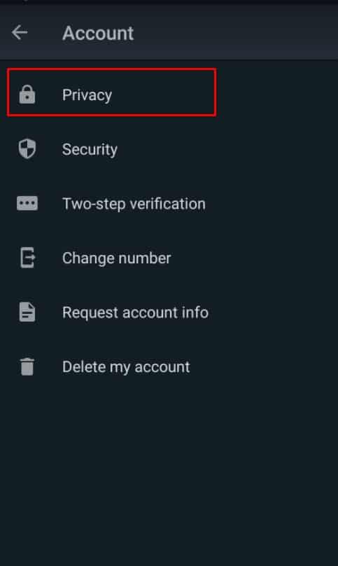 بعد ذلك ستظهر لك مجموعة كبيرة من الخيارات ومن خلالها قم بالضغط على خيار خصوصية أو Privacy ويضم هذا الخيار جميع إعدادات الخصوصية التي يمكنك الحصول عليها من خلال تطبيق واتس اب .