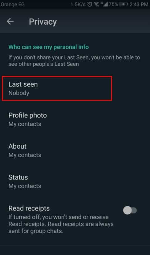 ستقوم بالضغط على خيار Last seen أو الظهور الأخير أو أخر ظهور وسنقوم بتلك الخطوة من أجل التعديل عليه فهناك 3 خيارات ستقوم بالاختيار من بينهم .