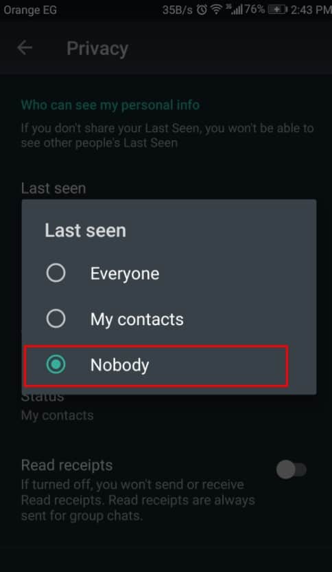 كما هو بتلك الصورة هناك خيار كل الأشخاص وهناك خيار أخر يتعلق بجهات الاتصال والخيار الأخير وهو Nobody الذي يعني لا أحد على الإطلاق وهذا هو الخيار الذي سنقوم بالضغط عليه من أجل البدء في عملية الظهور بشكل غير متصل عن استخدام واتساب في أي وقت تريده بكل سهولة .