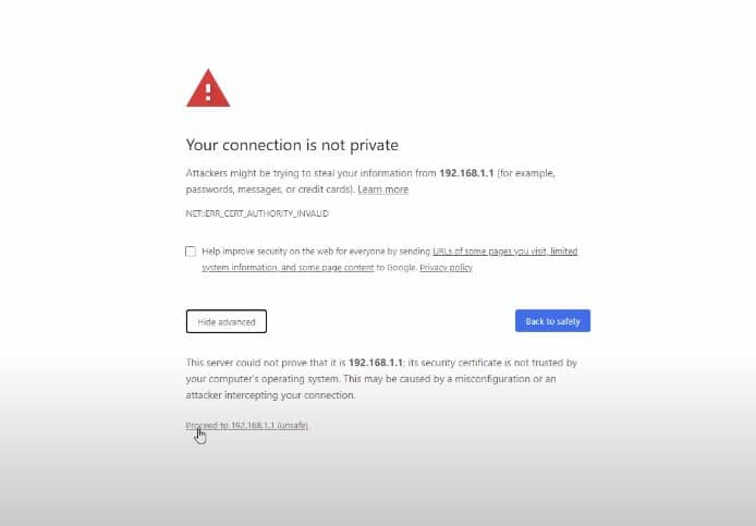 بعد ذلك ستظهر لك تلك الواجهة وهنا ستقوم بالضغط على خيار Proceed To 192.168.1.1 (unsafe) من أجل الدخول إلي صفحة تسجيل الدخول لإعدادات الراوتر .