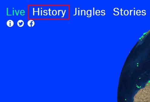 ثالثاً : وتستطيع أن تقوم بالاستماع إلي محطات الراديو التي توقفت عليها من قبل من خلال الضغط على كلمة History الموجودة في أعلى الموقع كما هو موضح في تلك الصورة .