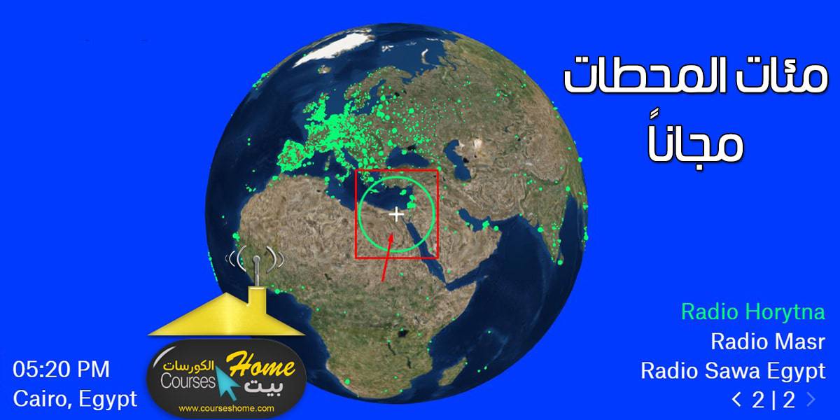 ثانياً : ستظهر أمامك الكرة الأرضية بالكامل ومتواجد عليها الكثير من النقط الخضراء ، كل ما عليك فعلة هو سحب تلك الدائرة والوقوف على أي نقطة خضراء وبهذا ستتمكن من الاستماع إلي محطات الراديو الموجودة في تلك المنطقة أو الدولة .