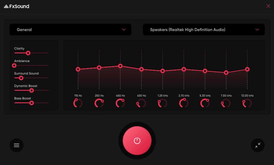 وستظهر لك واجهة البرنامج بعد ذلك كما هو بتلك الصورة بالضبط وكما هو واضح تلك هي واجهة الاستخدام وأمامك العديد من المؤشرات التي يمكنك التحكم بها من أجل التعديل على صوت جهاز الكمبيوتر ويمكنك التحكم في نقاء الصوت ومستوى ارتفاع الصوت والديناميكية الخاصة بالصوت والعديد من العوامل المؤثرة الأخرى التي عن طريقها ستتمكن من رفع مستوى الصوت بصورة كبيرة من الحفاظ على نقائه .