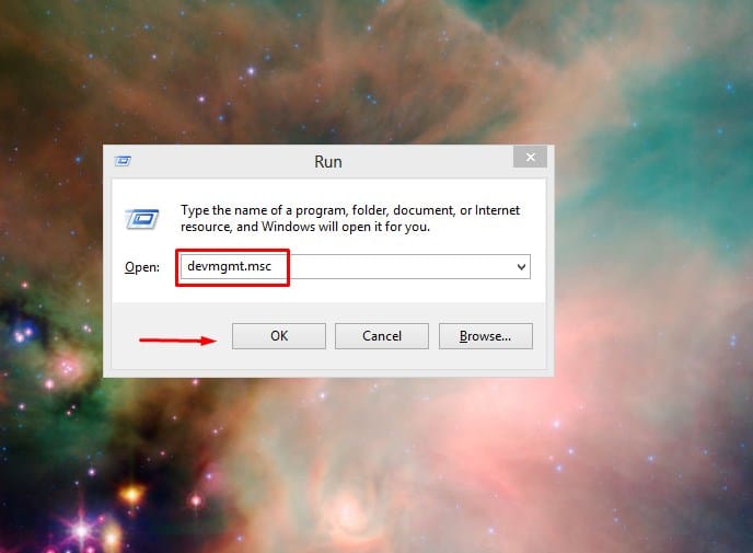 ثانياً : قم بنقل المسار التالي devmgmt.msc إلى القائمة بعد ذلك اضغط على كلمة Ok للانتقال .